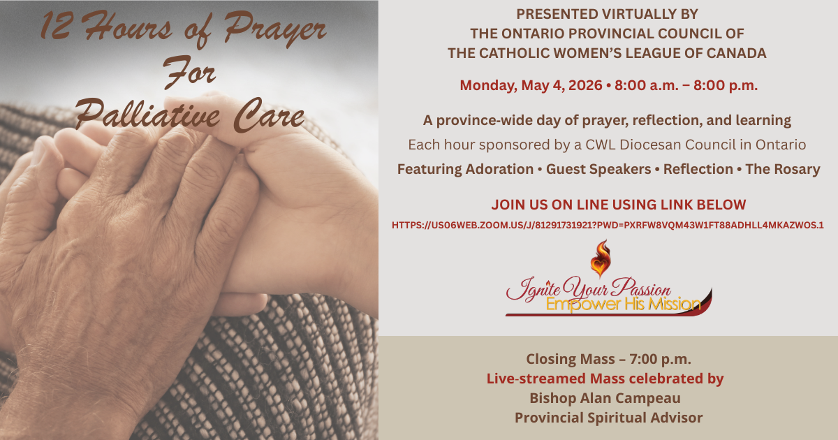 The Ontario Provincial Council invites all members, parish communities, and partners in faith to participate in our 12 Hours of Prayer for Palliative Care, a province‑wide virtual gathering dedicated to prayer, formation, and advocacy for compassionate palliative care in Ontario and across Canada.