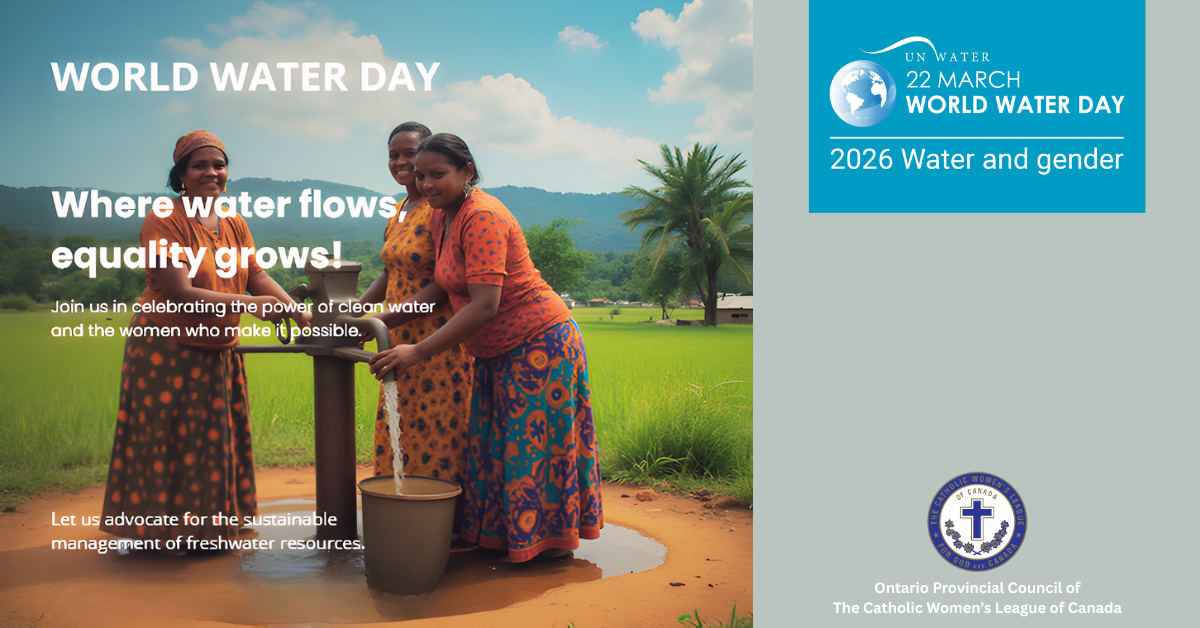 The United Nations reminds us that the global water crisis does not affect all people equally. “Where people lack the human rights to safe drinking water and sanitation, inequalities flourish, with women and girls bearing the brunt.” As Catholic Women’s League members, we recognize the sacredness of water and our responsibility to protect it for future generations.